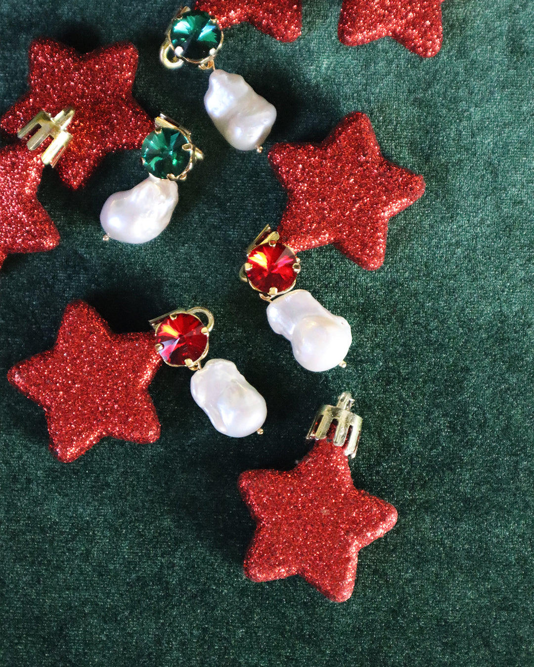 A luminous drop earring featuring crystals in various colors (champagne, dark blue, red, dark green or light purple) paired with natural baroque pearls. Each piece is uniquely shaped, giving every pair its own one-of-a-kind beauty. The pearl piece is a removable piece that you can wear just the crystal stud or the crystal stud with the pearl.